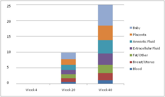 Based on this chart a woman who is 5’4” tall weighing between 117 and 151 lbs should gain between 25 and 35 pounds during pregnancy for optimal health for her and her baby. The weight gain recommendation is to supply adequate energy and nutrients to support tissue growth in several areas and averages 300 calories daily. This energy cost is not even throughout the pregnancy. The beginning of pregnancy demands little to no additional energy, while the last half sees a large surge in energy needs. Figure 1 below shows an estimated breakdown of the components of a 25 pound weight gain during the pregnancy for a 7 pound baby.