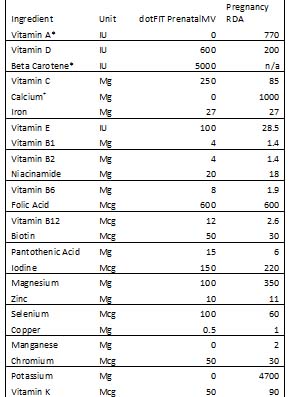dotFIT recommends the use of a multivitamin formula for everyone, especially women of child bearing years. Iron and folic acid can be very difficult to consume in the quantities required by pregnancy, which is why the American College of Obstetricians and Gynecologists endorses the use of supplements to supply iron for pregnant women. Ask your doctor for instructions if you have been diagnosed with any blood disorder, have a history of birthing children with neural tube defects or take medicine for seizures. Otherwise, it is prudent to use the dotFIT PrenatalMV™ or a prescription prenatal multivitamin/mineral supplement for the duration of the pregnancy. This will augment your best attempts at eating a perfect diet. The table below shows the contents of the dotFIT PrenatalMV along with the RDA for pregnant women aged 18 to 50.